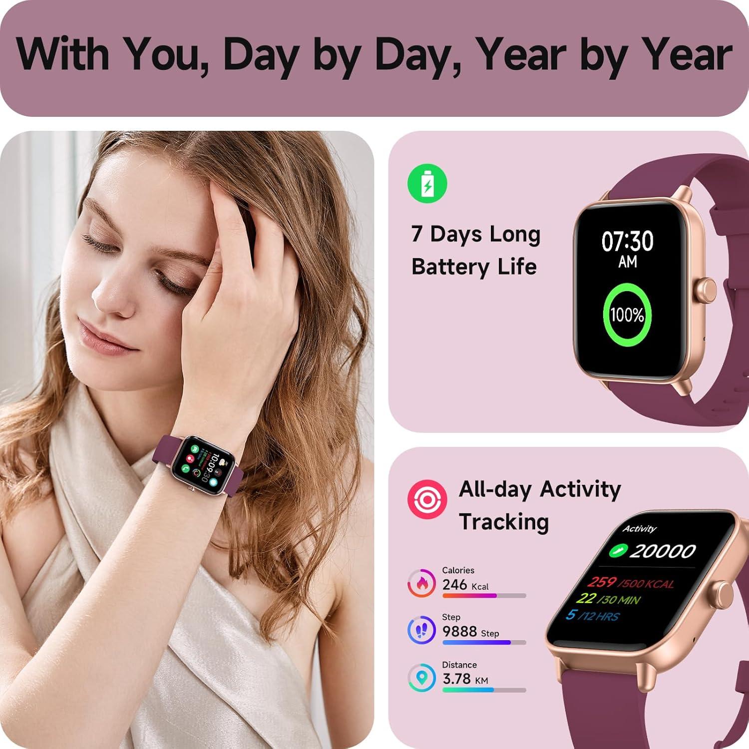 【100 Sports Modes & IP68 Waterproof】 The women's smart watch provides over 100 exercise modes, such as running, yoga, jumping jack, sit-ups, etc. During your exercise, it will record your data like heart rate, steps, calories burned, distance and active hours in real time. The fitness tracker is IP68 waterproof so you can wear it during outdoor activities, rainy days, washing hands.